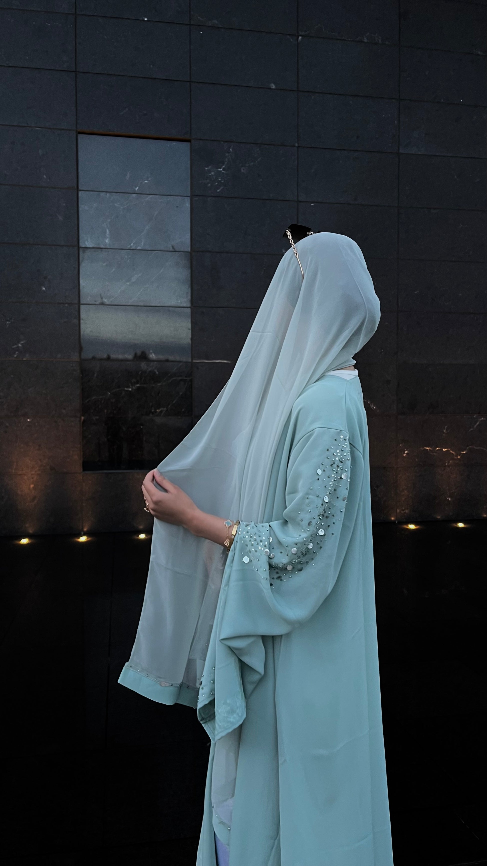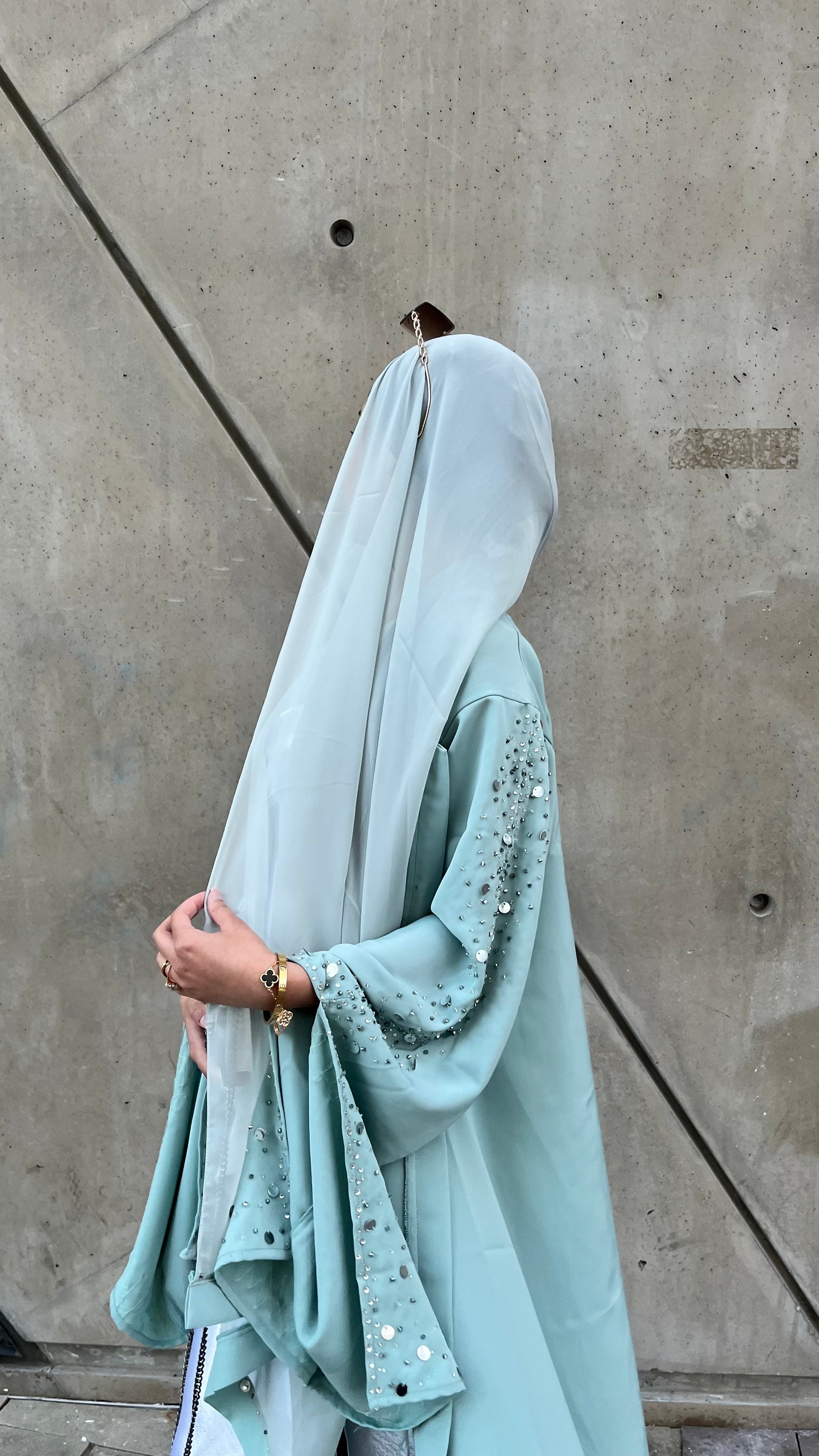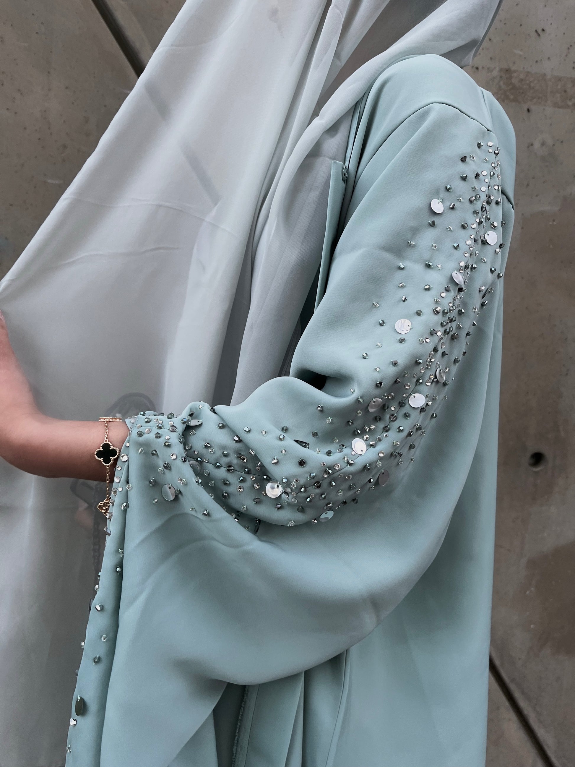 Bedazzle yourself for Eid and any other events in our Amani two-piece set in Sage. This colour shade is perfect for any time of the day - appearing light and lively under the sun, or brooding and luxurious in the dark. Splurge on this stunning piece as a lavish edition to your wardrobe. The dramatic sleeves of our Amani set are to die for, with a little spicy flair to the chiffon scarf to match the abaya. Perfect for any event or occasion you wish to dress up for - the choice is yours.