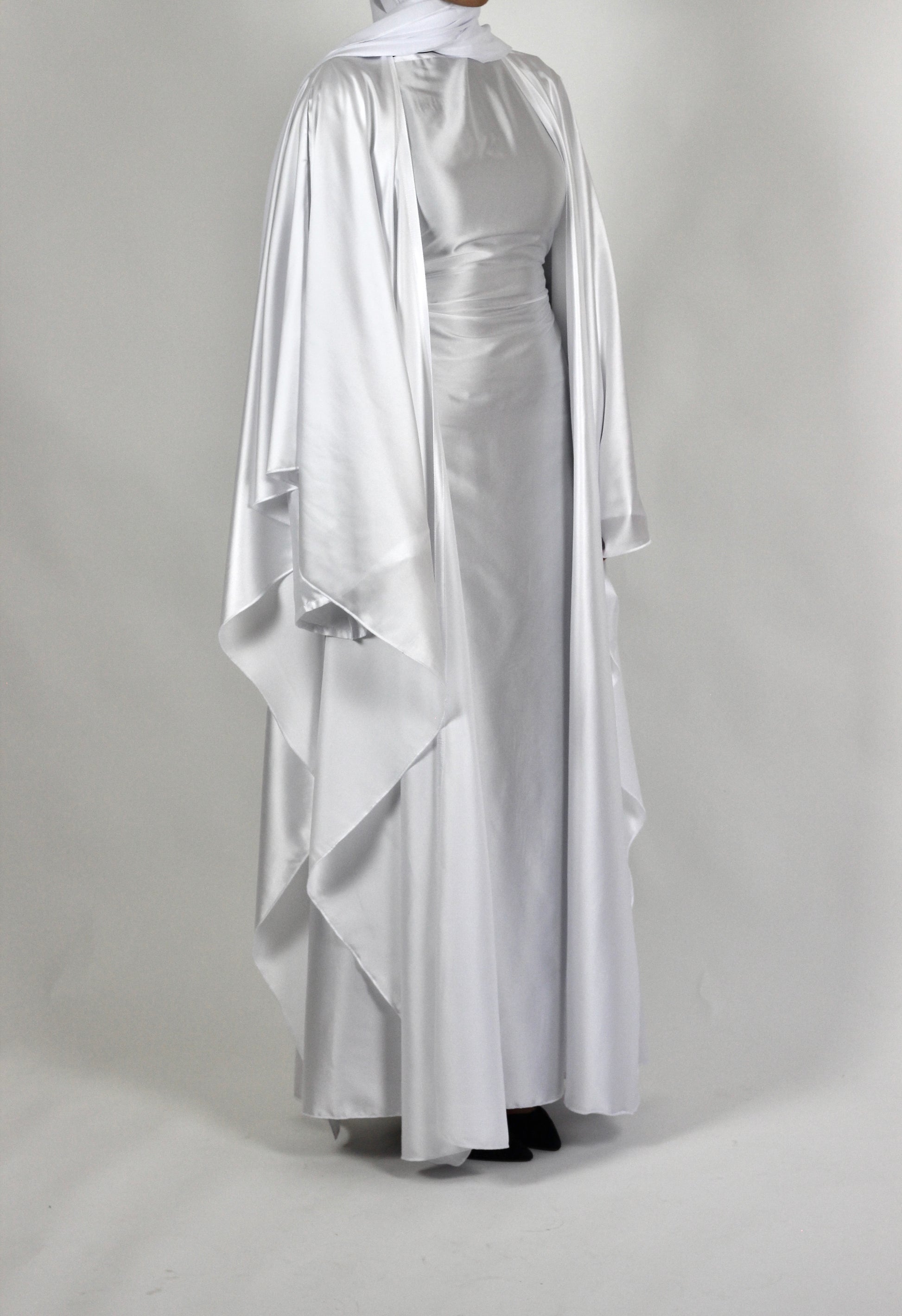 Drape yourself in our Ilara set in pale rose - a gorgeous three-piece including an outer butterfly cut abaya, inner slip dress, and scarf.