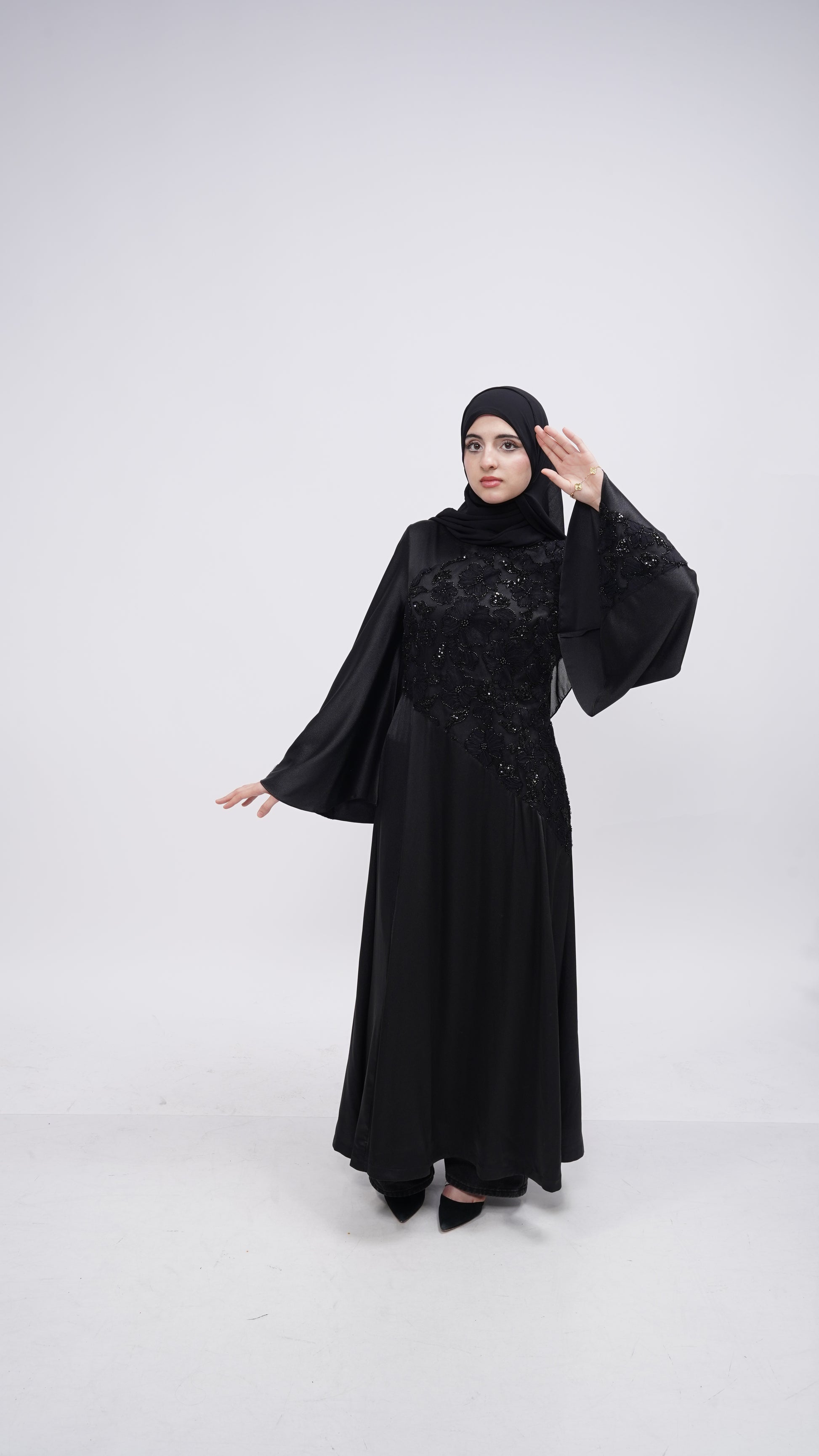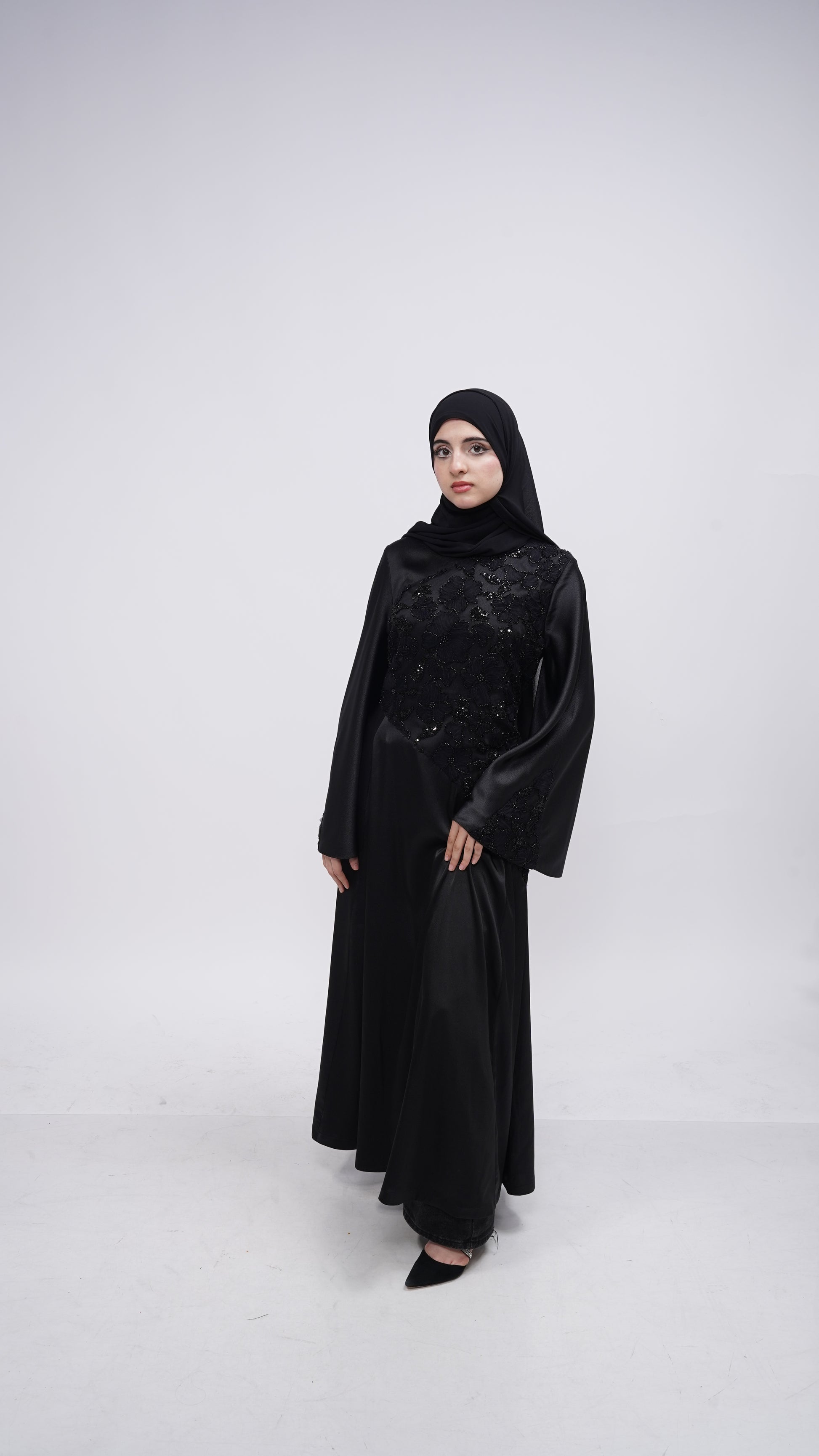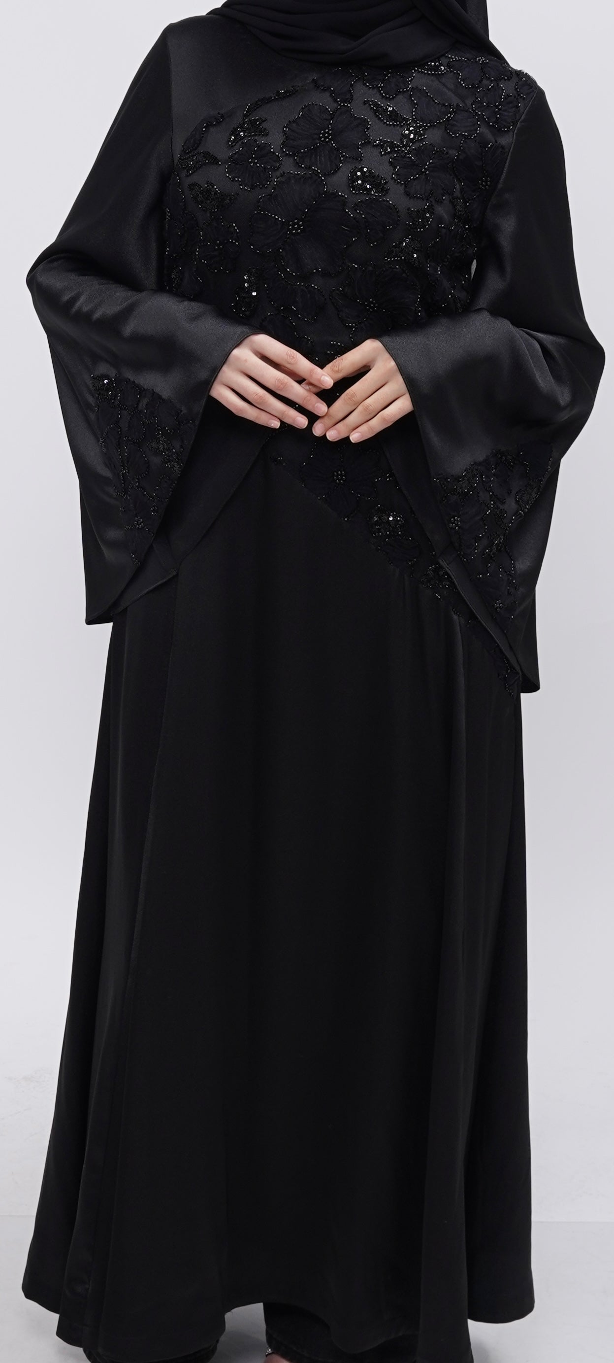 Crafted in black, Ophelia features delicate floral lace carefully placed along the torso and sleeves, revealing intricate detail without excess. Her flowing A-line silhouette moves with ease and grace, while soft bell sleeves add a romantic, dramatic touch. A corset belt at the back cinches the waist, creating a sculpted hourglass shape that feels both powerful and refined.