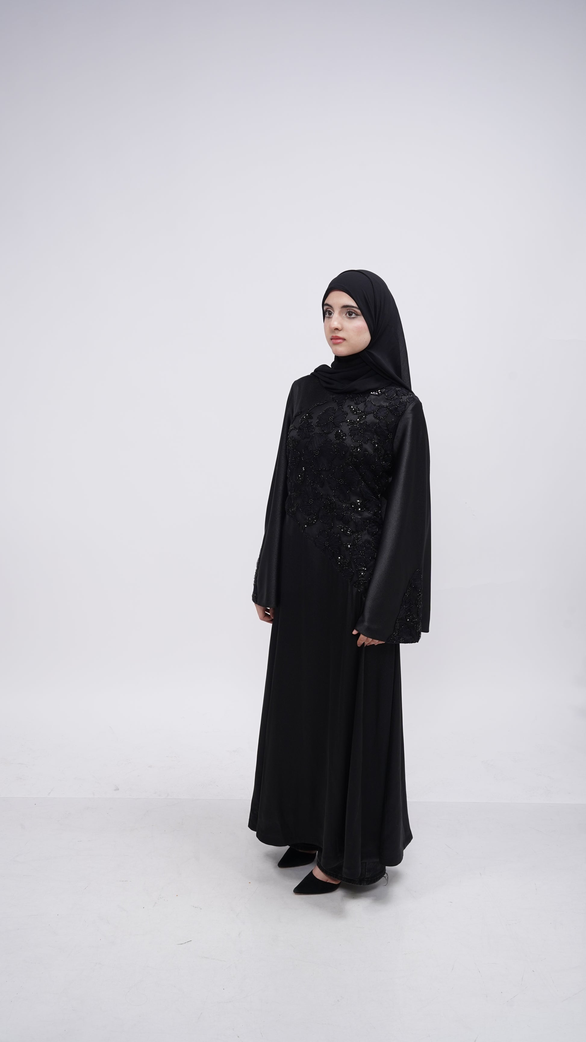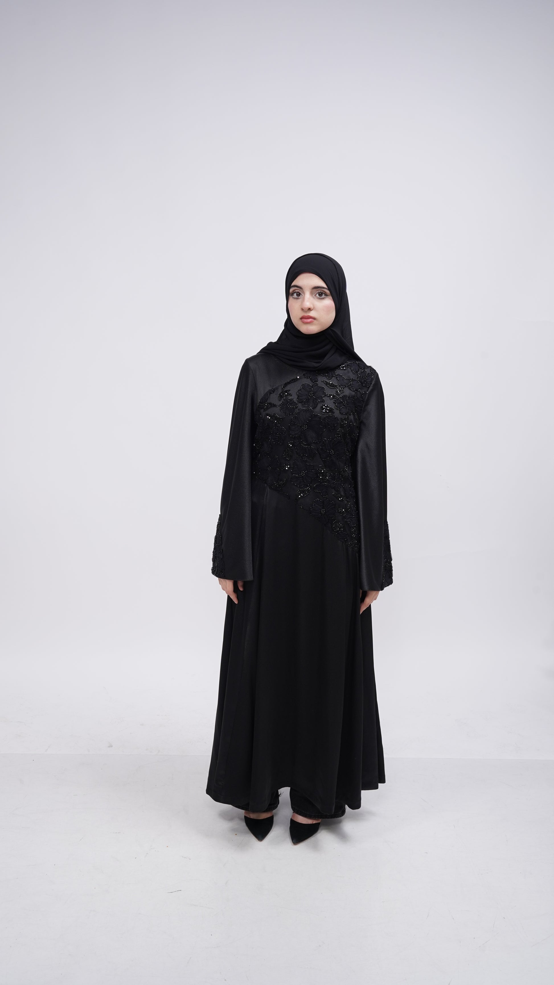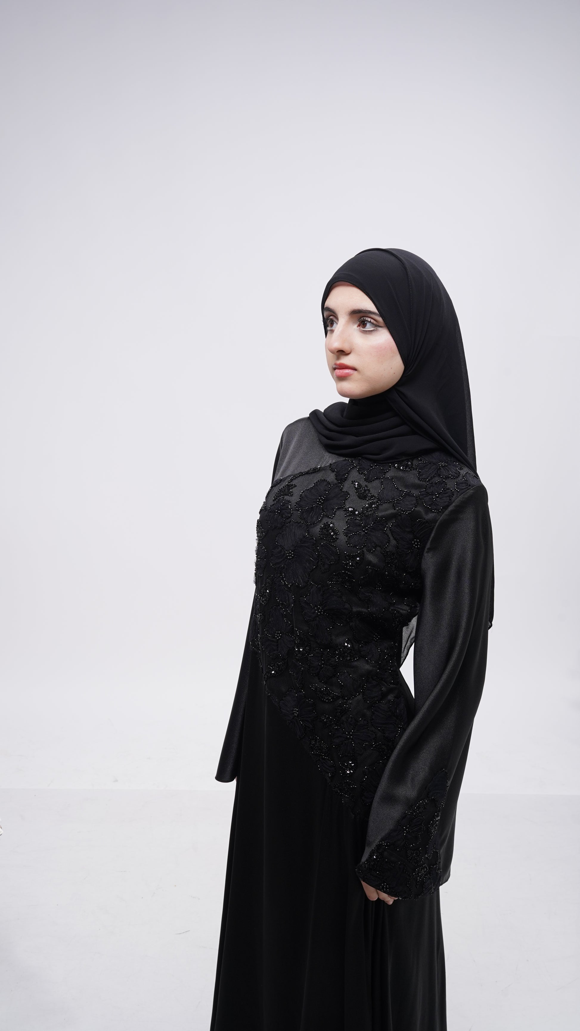 Crafted in black, Ophelia features delicate floral lace carefully placed along the torso and sleeves, revealing intricate detail without excess. Her flowing A-line silhouette moves with ease and grace, while soft bell sleeves add a romantic, dramatic touch. A corset belt at the back cinches the waist, creating a sculpted hourglass shape that feels both powerful and refined.