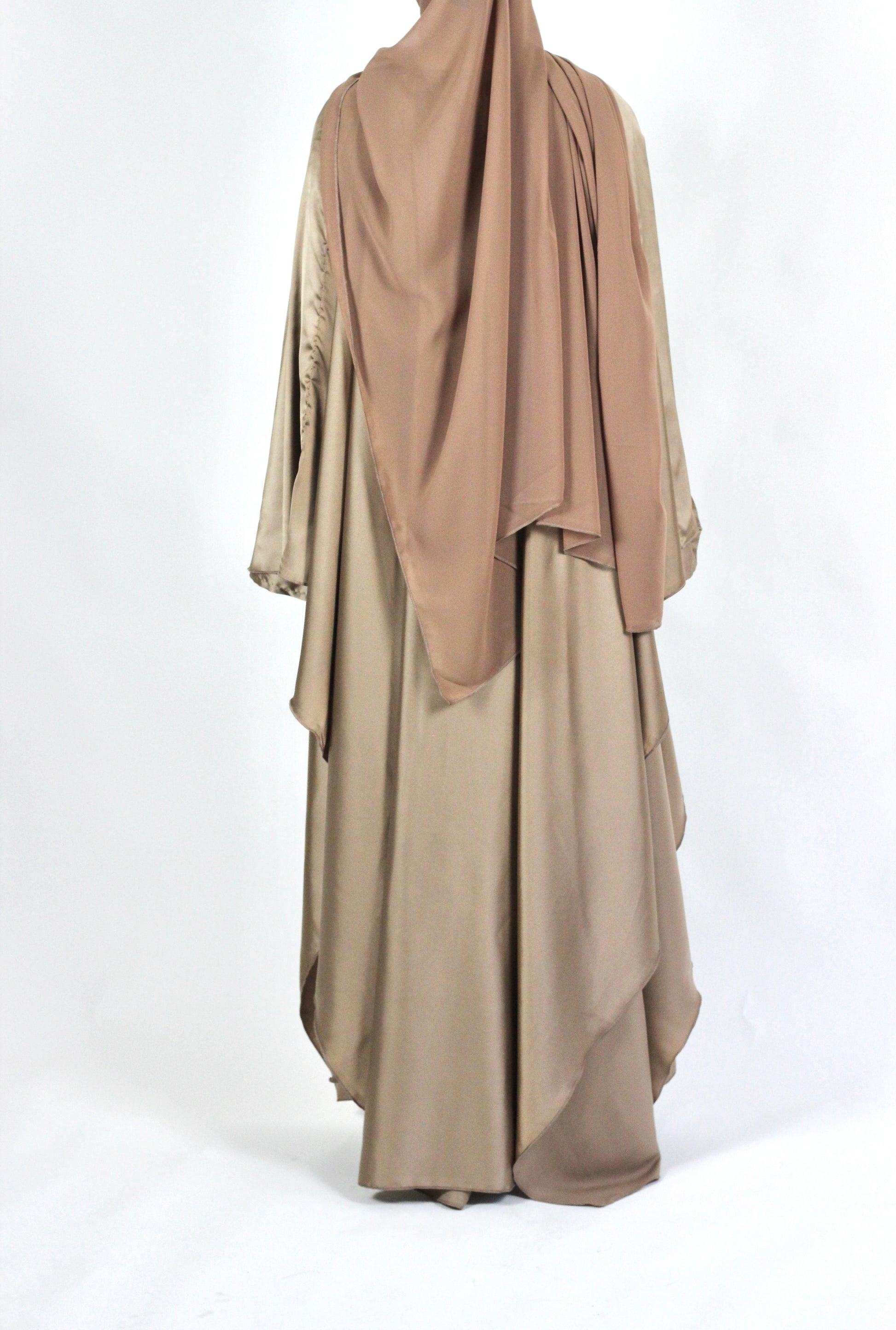 The outer and inner abaya are curated to ensure a loose fit. The inner abaya also has an option to tighten the belt when desired.