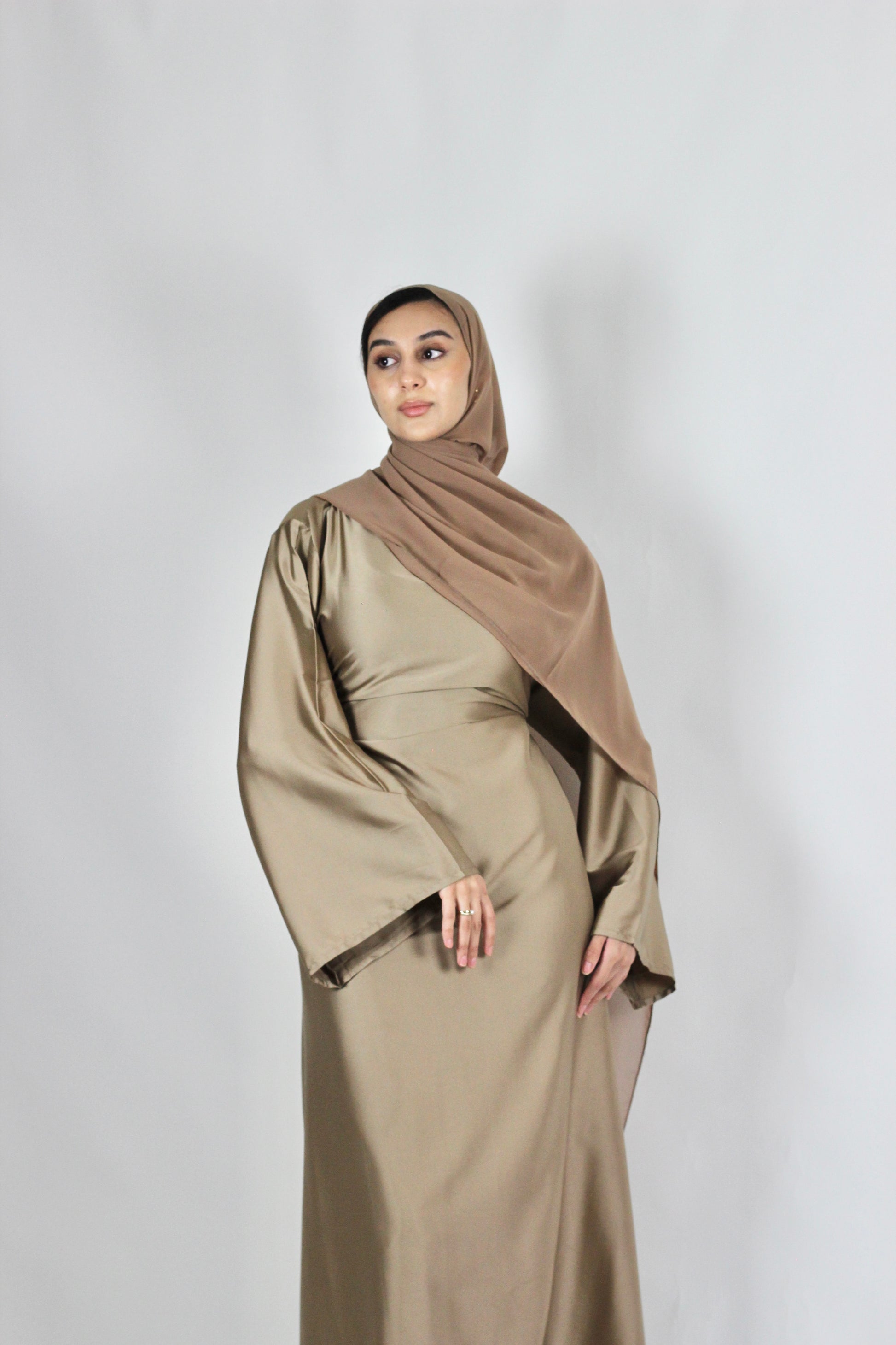 Drape yourself in our Ilara set in royal moss - a gorgeous three-piece including an outer butterfly cut abaya, inner slip dress, and scarf.